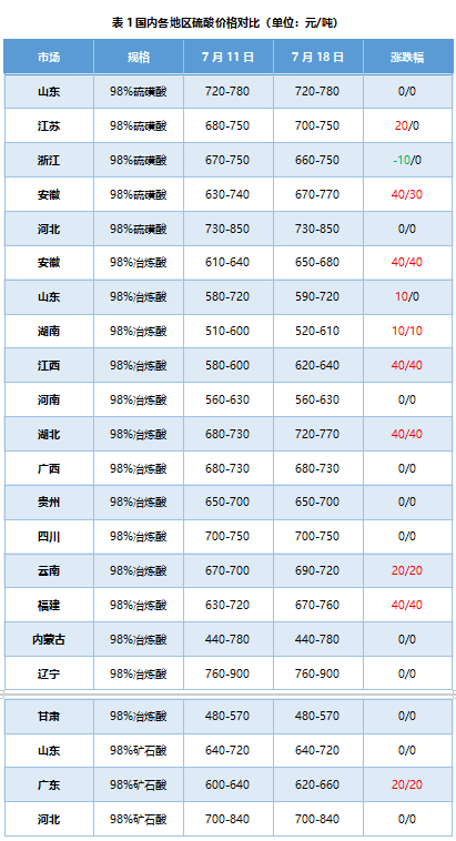 本周期國內硫酸市場呈漲跌互現格局。截至7月18日,98%冶煉酸均價661元/噸,較7月11日上漲12元/噸,漲幅1.80%;98%礦石酸均價788元/噸,較7月11日下跌3元/噸,跌幅0.42%;98%硫磺酸均價746元/噸,較7月11日上漲9元/噸,漲幅1.16%。
