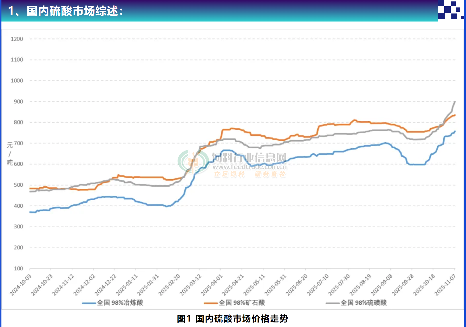 本周期國內硫酸市場呈上行態勢。截至11月7日,98%冶煉酸均價758元/噸,環比上周上漲24元/噸,漲幅3.33%;98%礦石酸均價836元/噸,環比上周上漲21元/噸,漲幅2.56%;98%硫磺酸均價899元/噸,環比上周上漲66元/噸,漲幅7.98%。