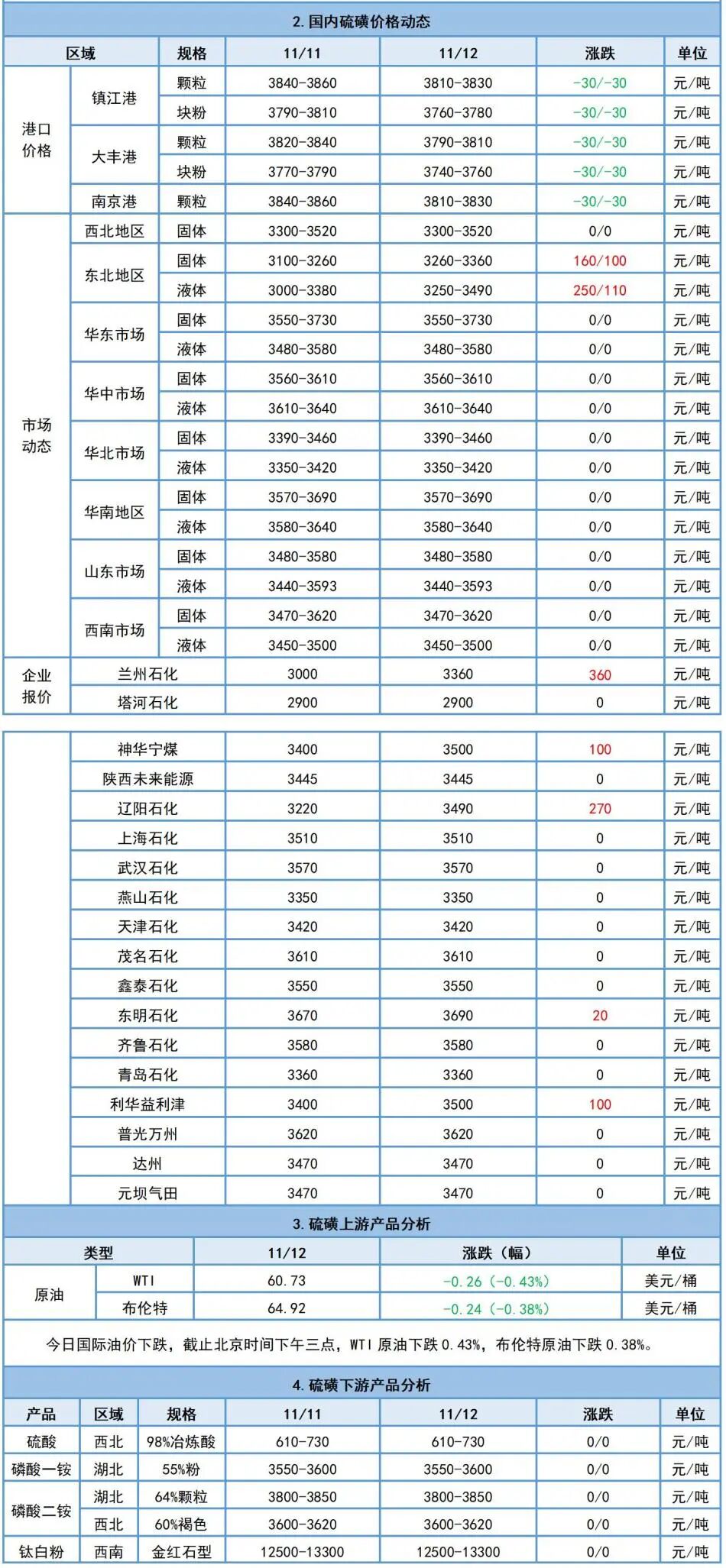 11月12日硫磺日評:國產硫磺價格穩中有漲,港口硫磺價格高位回調