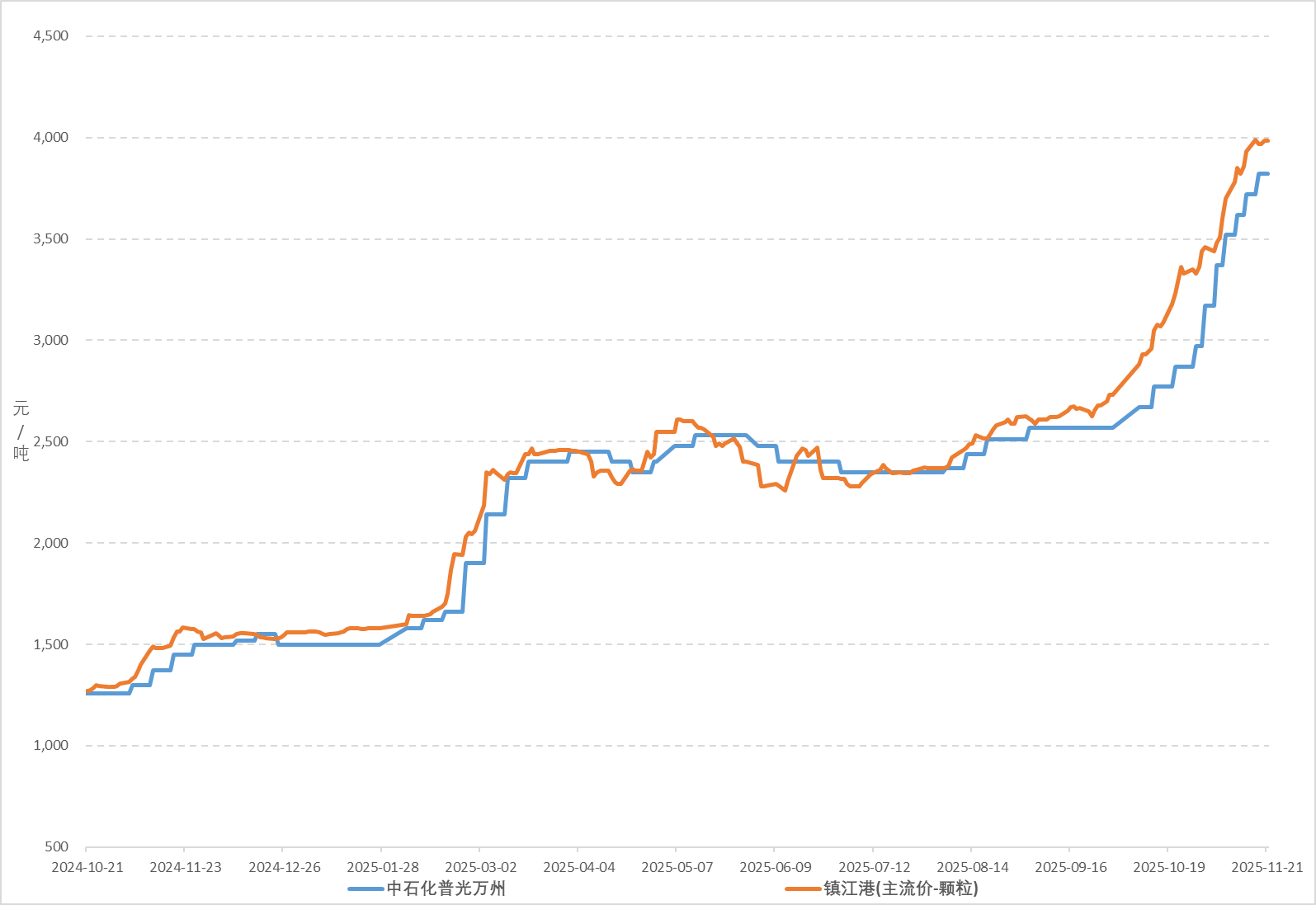 本周期港口硫磺市場價格震蕩上行;截至11月21日,鎮江港顆粒硫磺價格3985元/噸,較11月14日上漲55元/噸,漲幅1.40%。 本周期國際硫磺市場表現強勢,為國內現貨市場提供強勁支撐,加之國內大型煉廠硫磺銷售招標連續上漲,各地主營煉廠報價同步跟漲,進一步強化市場信心,持貨商普遍捂盤惜售,低價貨源依舊難尋,港口硫磺市場價格繼續上漲,不過現貨交投氛圍趨于理性,工貿雙方意見分歧互動消息有限,抑制漲幅。