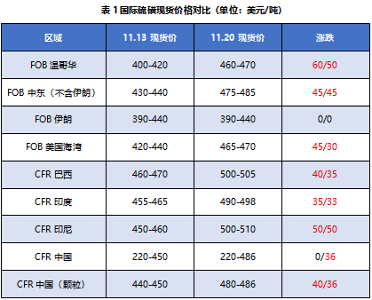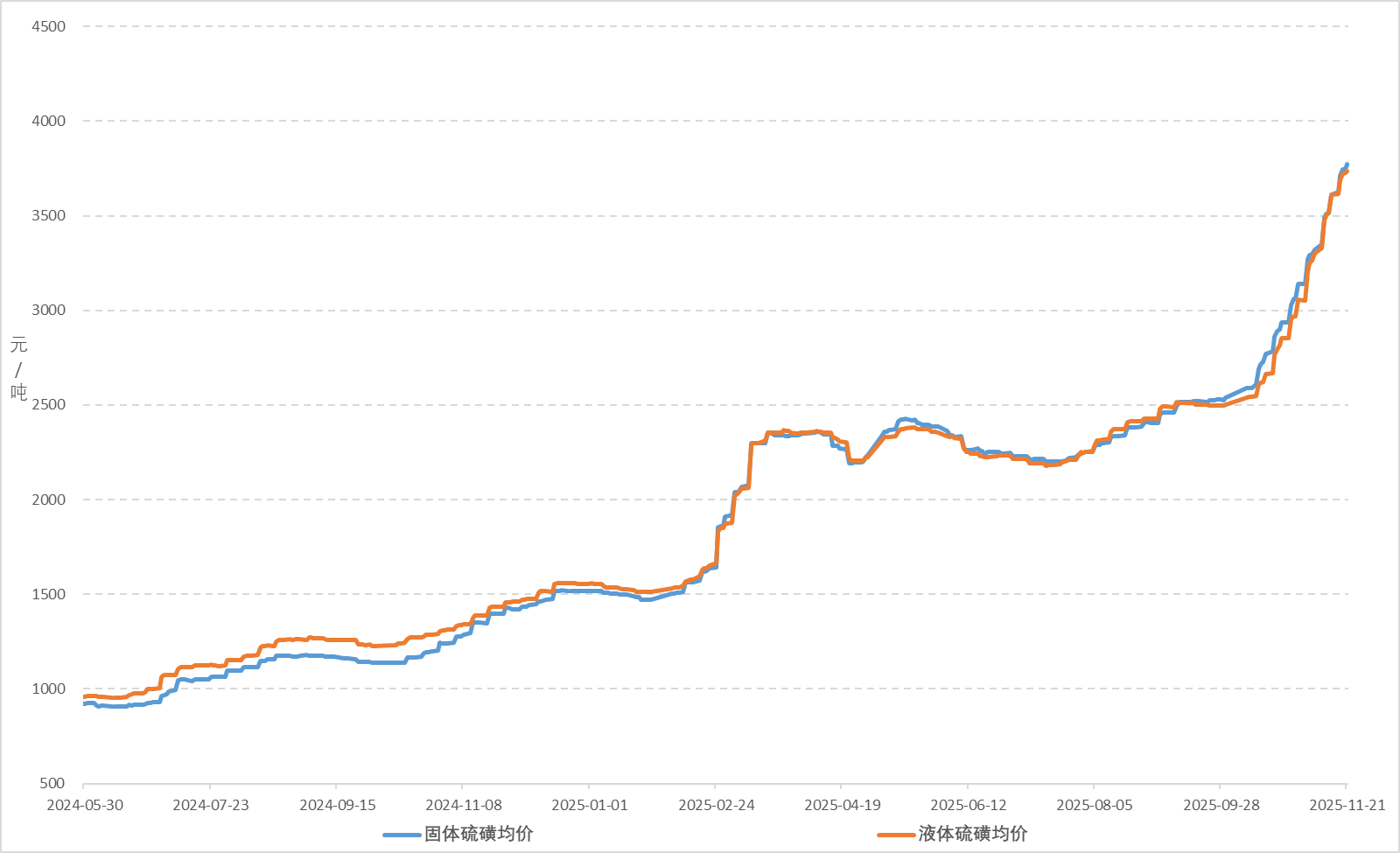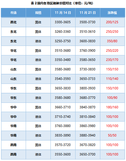 本周期國產硫磺市場均價持續走高。截至11月21日,固體硫磺均價3771元/噸,較11月14日上漲162元/噸,漲幅4.48%;液體硫磺均價3737元/噸,較11月14日上漲126元/噸,漲幅3.50%。