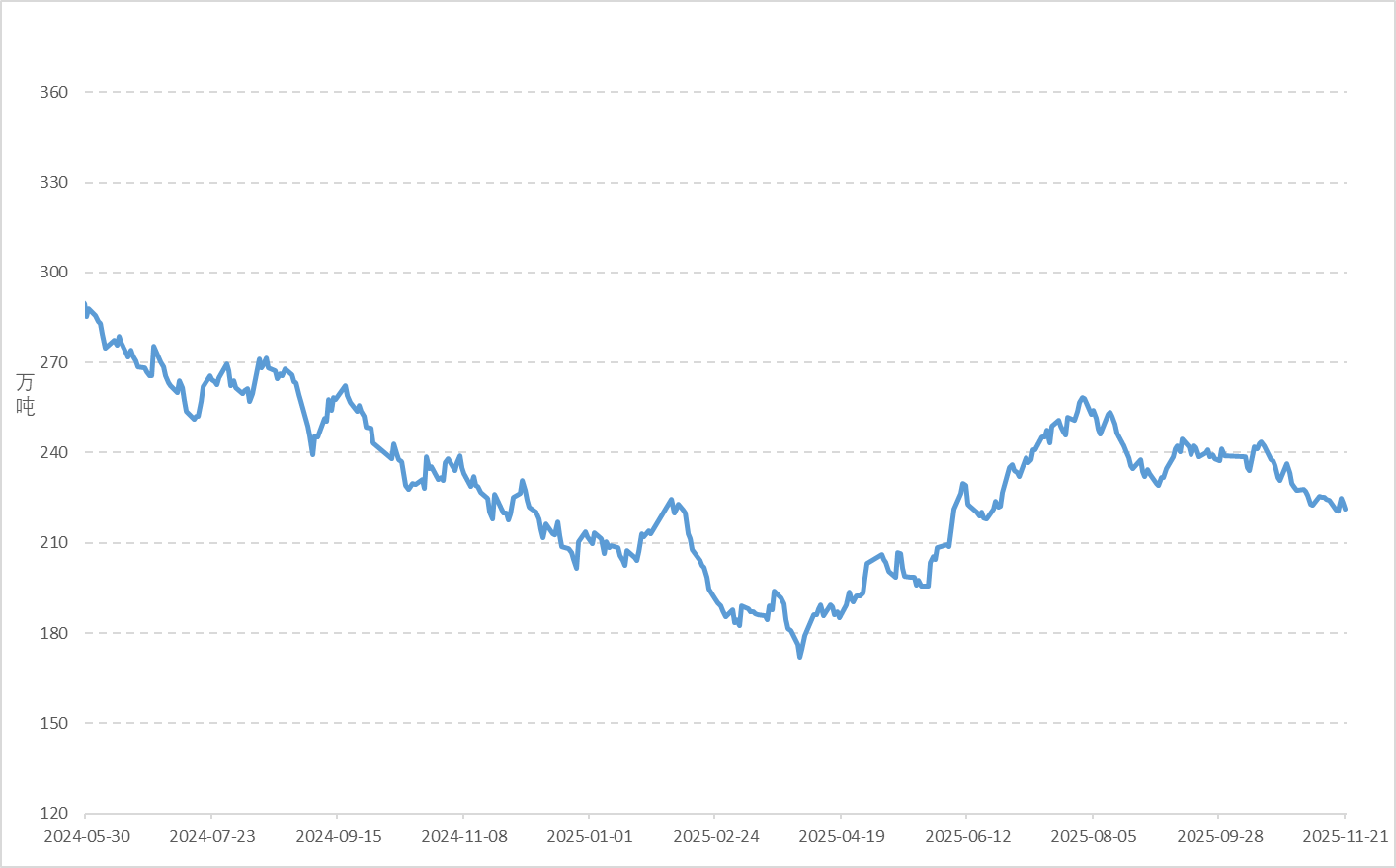 本周期港口硫磺庫存呈下降態勢;截至11月21日,港口硫磺庫存221.23萬噸,較11月14日的224.04萬噸,減少2.81萬噸,降幅1.25%