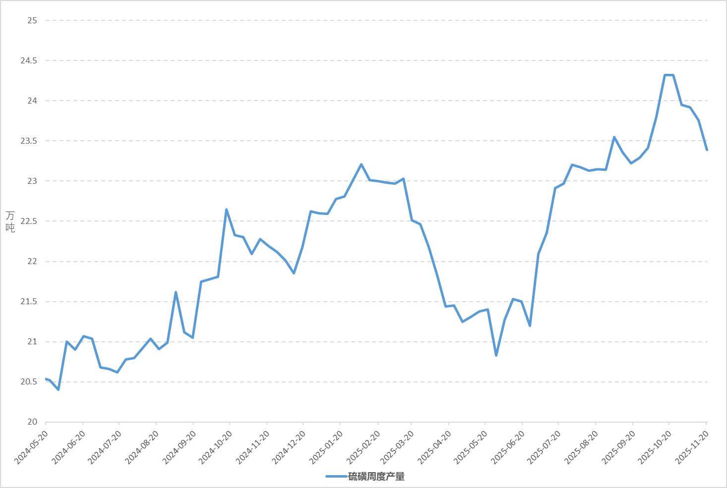本周期中化泉州煉廠裝置停車,山東華星煉廠供應恢復,其他存量裝置并無明顯變動,全國硫磺市場供應繼續減量;截至11月20日,國內硫磺周度產量23.39萬噸,環比上周減少0.37萬噸。