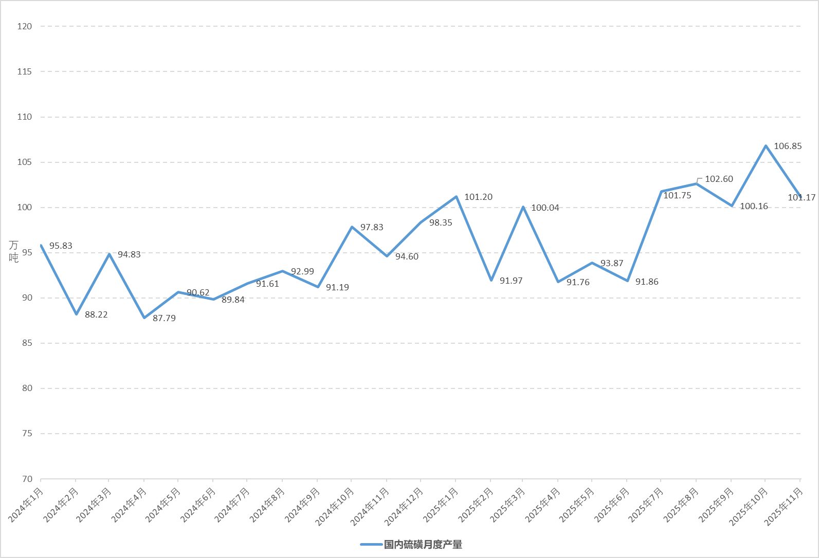 11月,國內硫磺產量101.17萬噸,環比減少5.68萬噸,降幅5.32%。