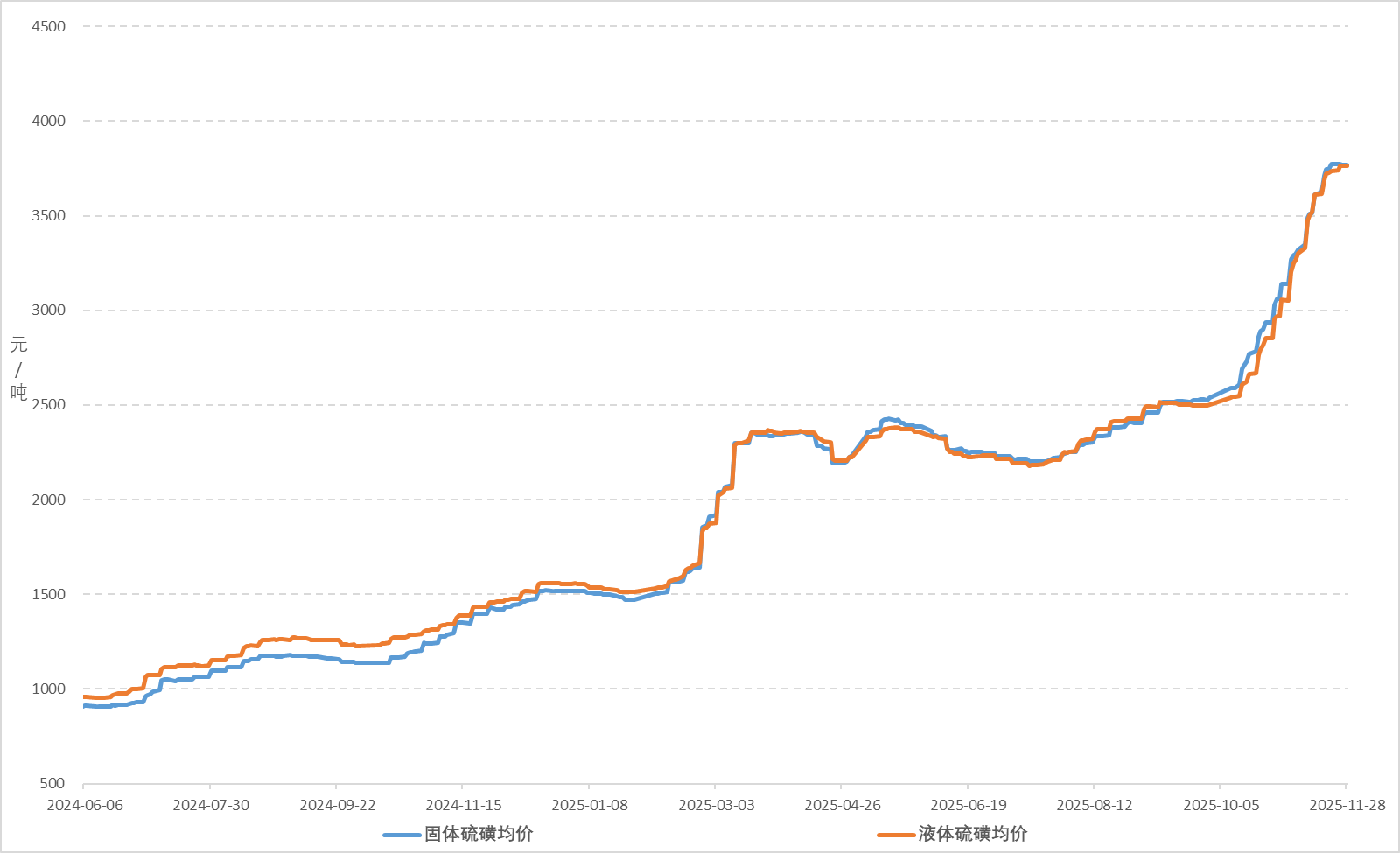 截至11月28日,國內固體硫磺均價3767元/噸,環比上漲628元/噸,漲幅19.99%;國內液體硫磺均價3766元/噸,環比上漲712元/噸,漲幅23.30%。