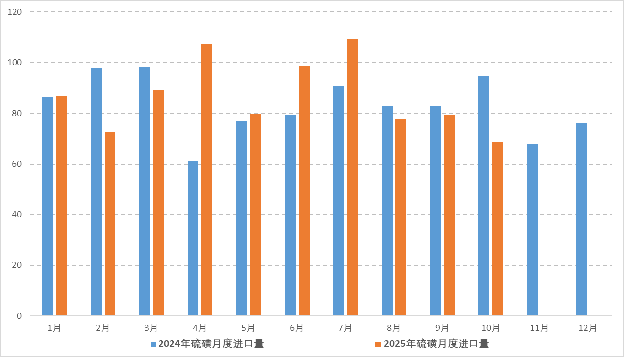 2025年10月,中國硫磺進口68.89萬噸,環比下降13.14%,同比下降27.14%。1-10月中國硫磺進口累計869.87萬噸,累計同比增加2.16%。