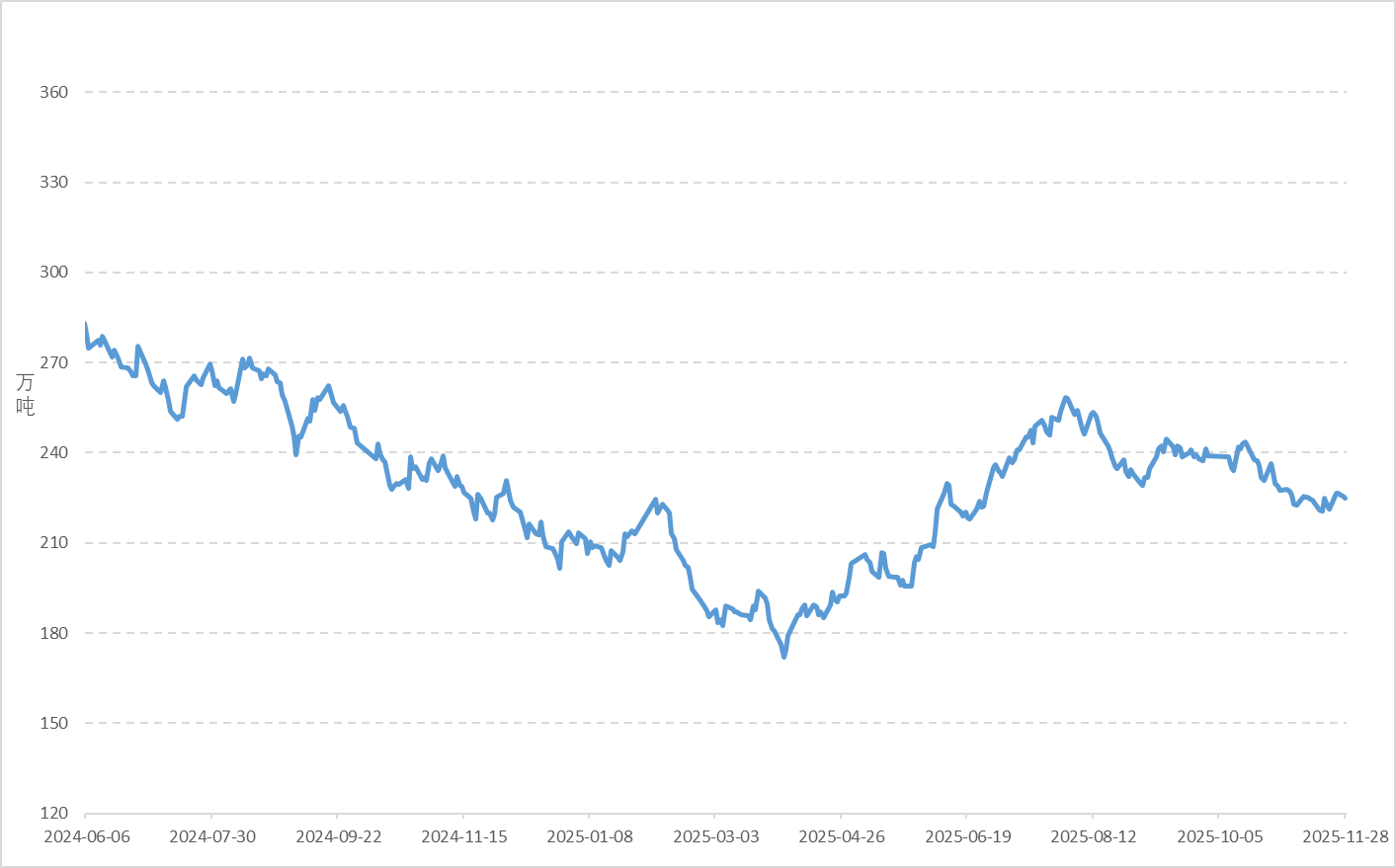截至11月28日,港口硫磺庫存達224.98萬噸,相較于10月31日的227.62萬噸,減少2.64萬噸,降幅1.16%。