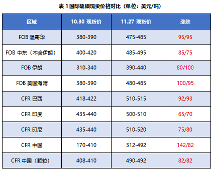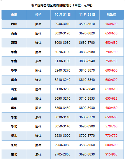 11月,受國際硫磺市場強勢以及港口硫磺漲價氛圍帶動,國產硫磺市場價格全面寬幅上行,幅度500-965元/噸。