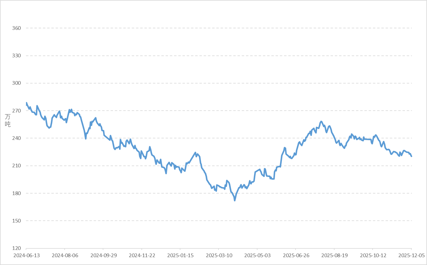 本周期港口硫磺庫存呈下降態勢;截至12月5日,港口硫磺庫存220.28萬噸,較11月28日的224.98萬噸,減少4.7萬噸,降幅2.09%。