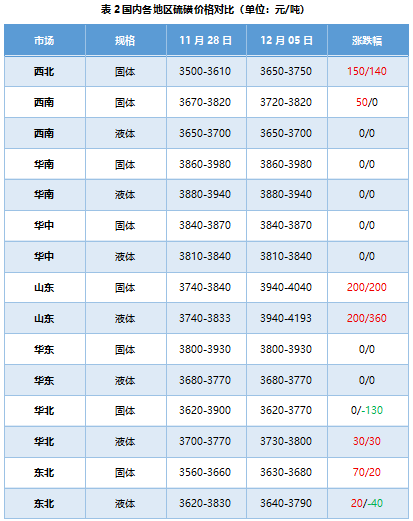 山東、華北、西南地區受國際硫磺價格持續高位以及港口硫磺價格寬幅上行帶動,區內煉廠多根據自身情況向上補漲,幅度30-400元/噸;西北地區煉廠出貨情況較好,競拍成交維持在較高水平,部分有順勢進行探漲操作,帶動區域市場價格上行,幅度40-150元/噸;東北地區下游企業對高價硫磺的競拍積極性普遍偏弱,高價資源報價回調,低價資源報價上調,幅度20-150元/噸;國內其他地區硫磺價格以穩呈現。