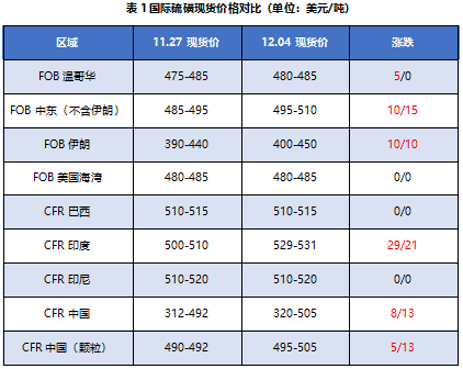 中東地區12月硫磺合約價大幅上漲至FOB495美元/噸,加之市場對俄羅斯硫磺供應短缺的擔憂仍在持續,受此影響,買家在每一輪交易中均接受了更高報價,目前印度東海岸和印度尼西亞的硫磺報價已達到530美元/噸(CFR)及以上。