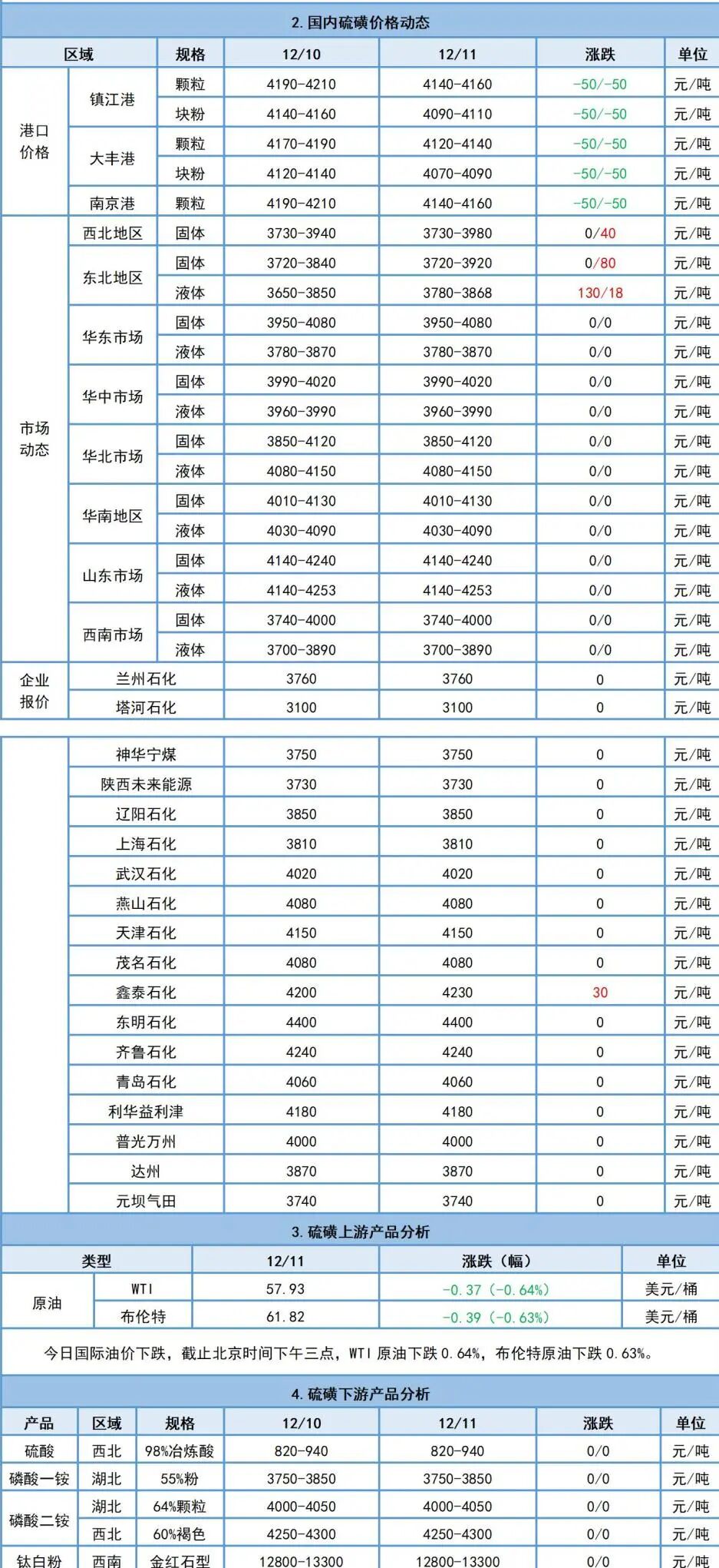 12月11日硫磺日評:國產硫磺價格局部上行,港口硫磺價格高位回調