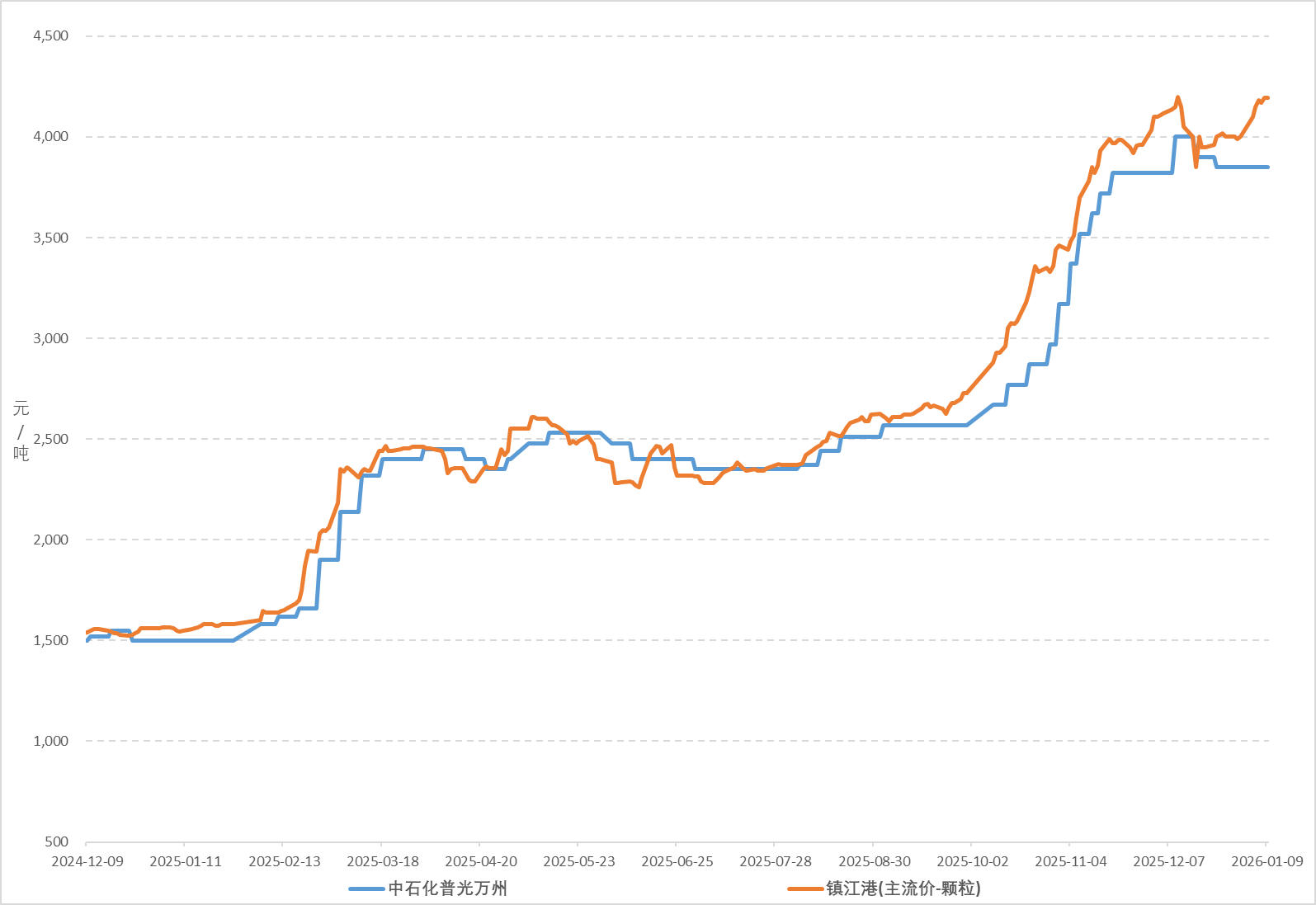 本周期港口硫磺市場價格高位上揚。截至1月9日,鎮江港顆粒硫磺價格上漲195元/噸至4195元/噸,漲幅4.88%。