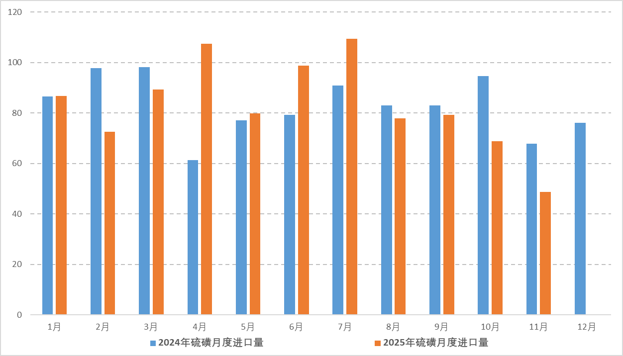 2025年11月,中國硫磺進口48.73萬噸,環比下降29.26%,同比下降28.08%。1-11月中國硫磺進口累計918.6萬噸,累計同比下降0.07%。