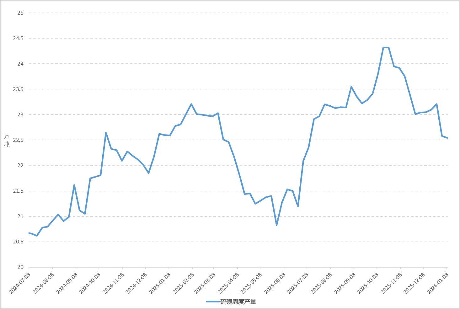 本周期全國硫磺市場供應窄幅減量;截至1月8日,國內硫磺周度產量22.54萬噸,環比上周減少0.04萬噸。