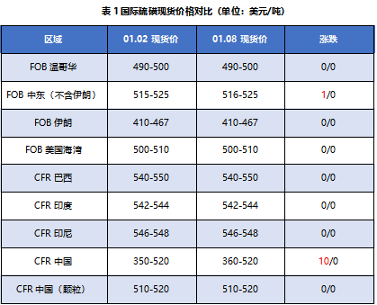 相關價格:中東地區1月硫磺官價在FOB516-520美元/噸,環比上月上漲21-25美元/噸;臺塑硫磺銷售招標價傳聞在FOB540美元/噸;倆則消息均對國內硫磺市場提供有力支撐。