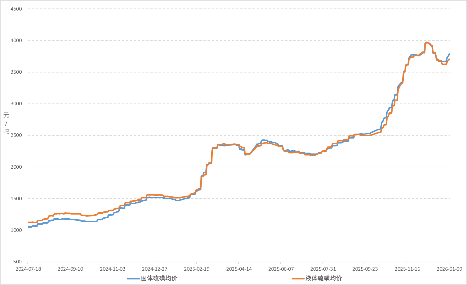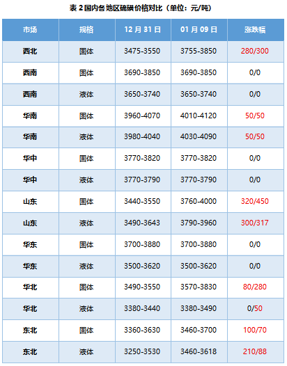 本周期國產硫磺市場均價上漲。截至1月9日,固體硫磺均價3789元/噸,較12月31日上漲122元/噸,漲幅3.32%;液體硫磺均價3704元/噸,較12月31日上漲83元/噸,漲幅2.28%。