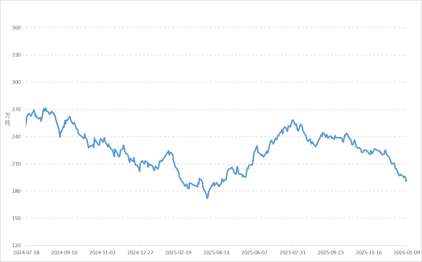 本周期港口硫磺庫存呈下降態勢;截至1月9日,港口硫磺庫存191.70萬噸,較12月31日的198.48萬噸,減少6.78萬噸,降幅3.42%。