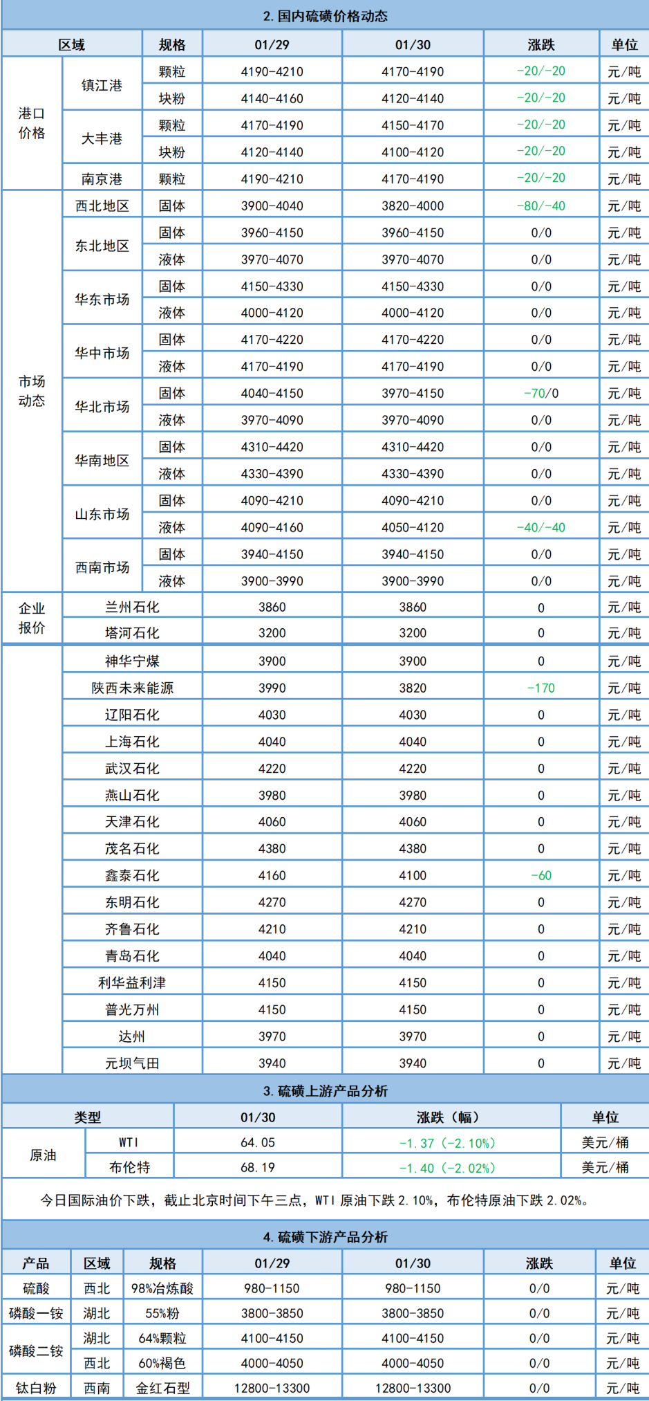 1月30日硫磺日評:國產硫磺價格局部下行,港口硫磺價格持續走低