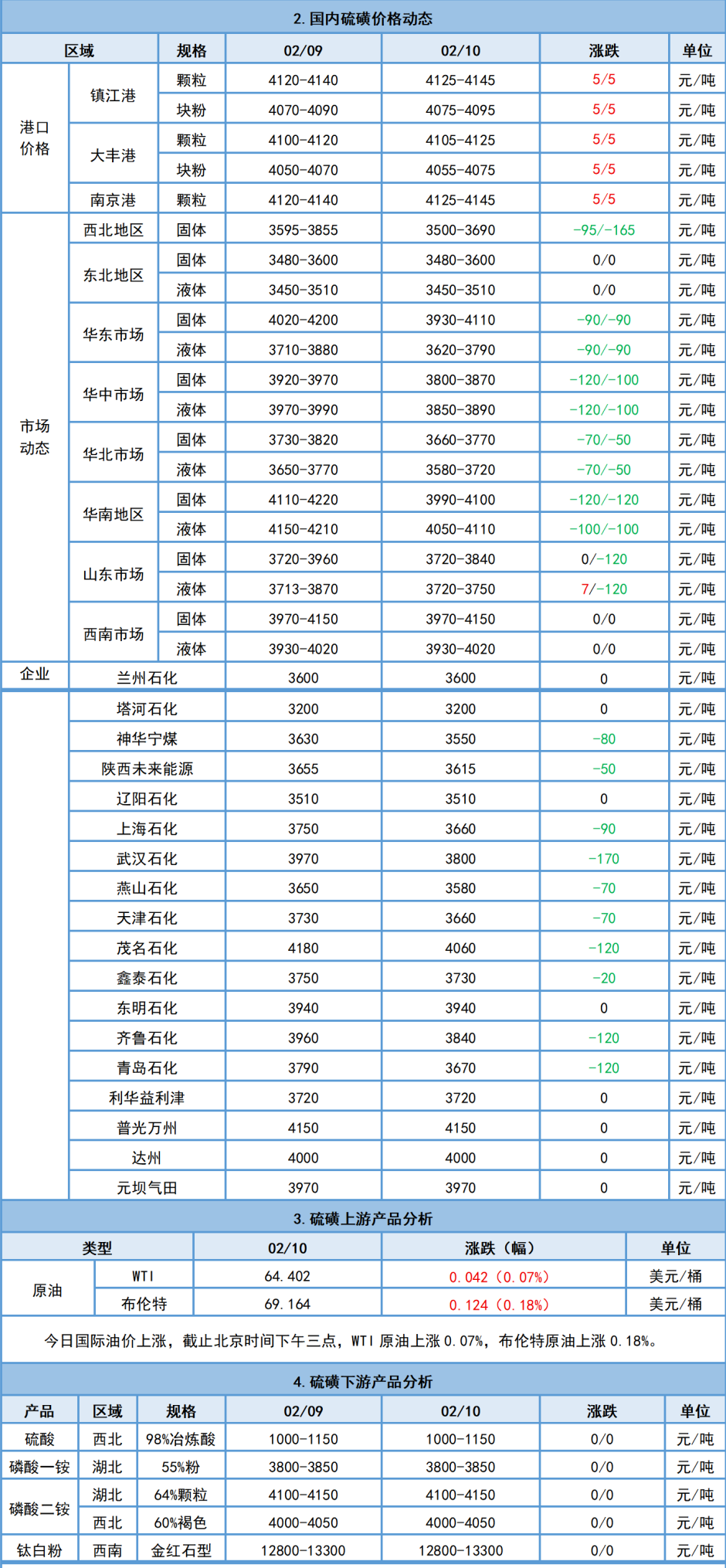 今日國產硫磺市場價格大勢下行,零星調漲。山東、華東、華北、華中、華南、西北地區煉廠多下調報價,零星上調,幅度10-190元/噸;西南、東北地區硫磺價格以穩呈現;預計下一交易日國產硫磺市場價格大穩小動。