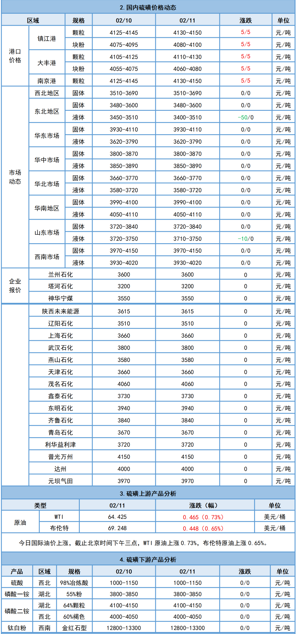 2026年2月11日硫磺日評:國產硫磺價格局部漲跌,港口硫磺價格繼續上漲