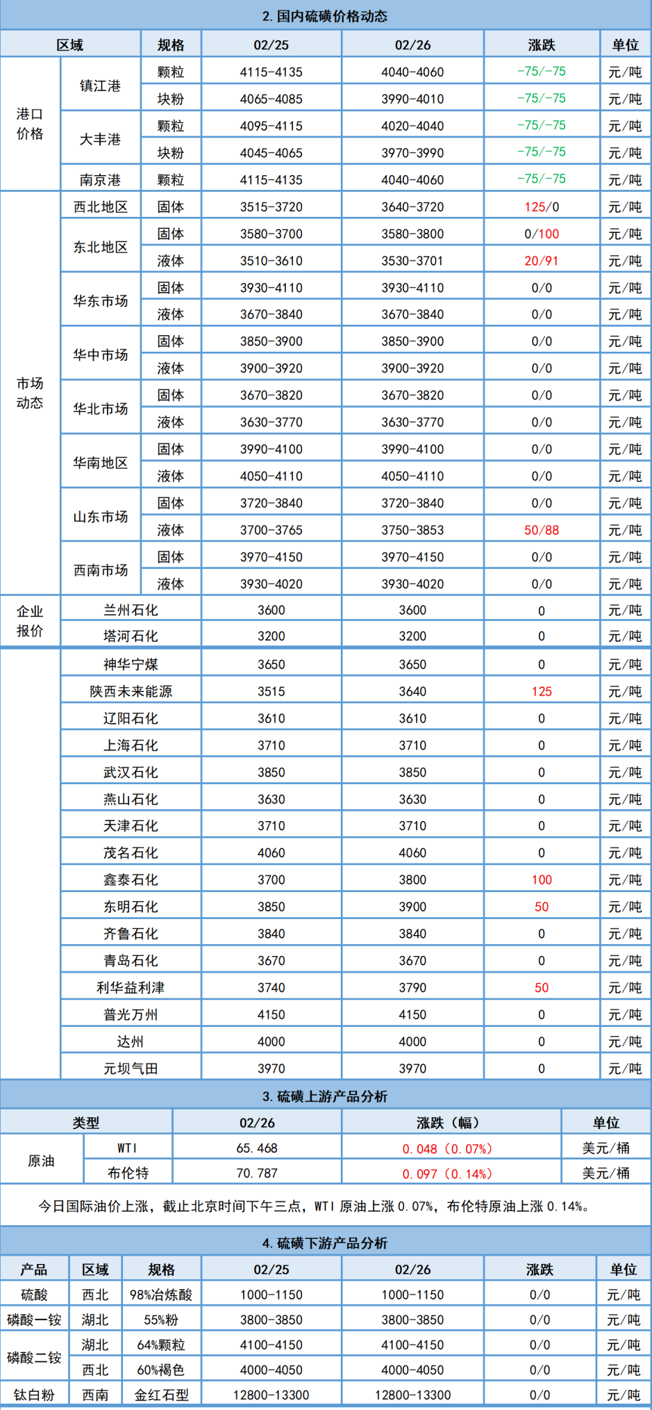 2026年2月26日硫磺日評:國產硫磺價格穩中有漲,港口硫磺價格持續走低