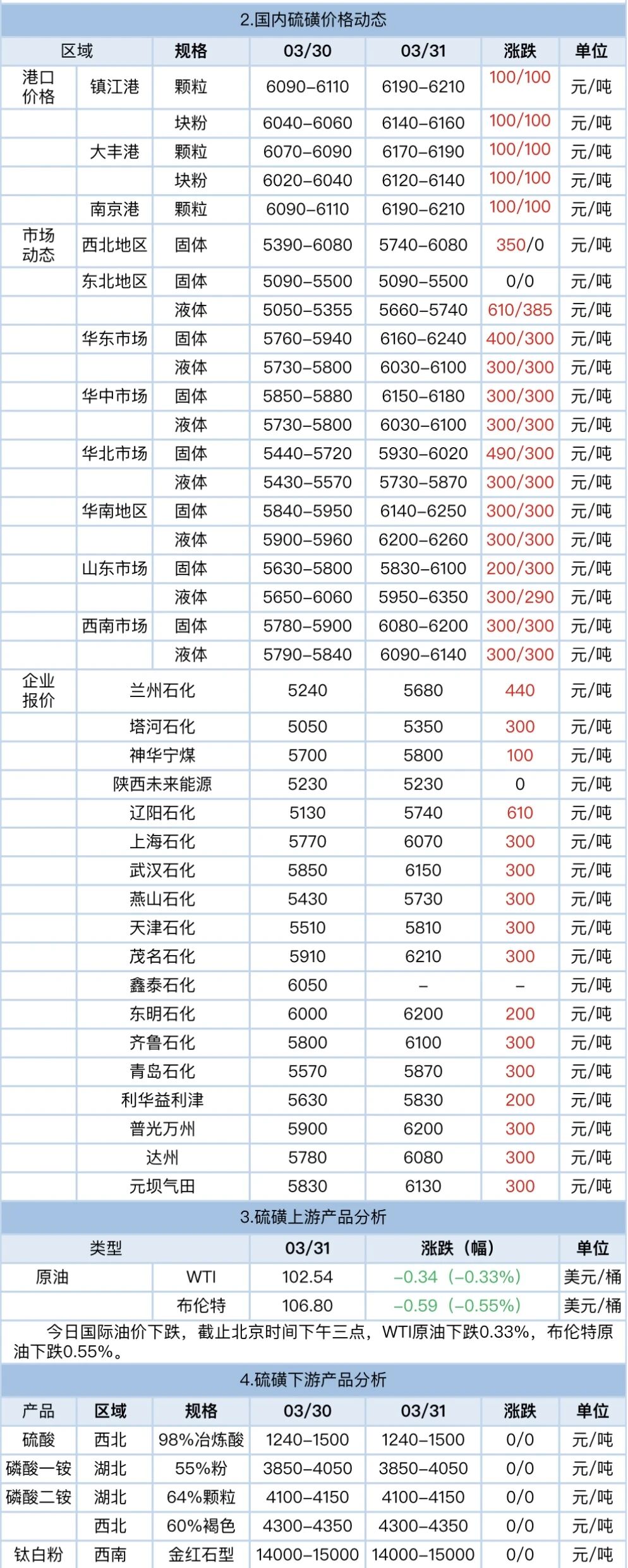 2026年3月31日硫磺日評:國內硫磺價格全面大幅上漲