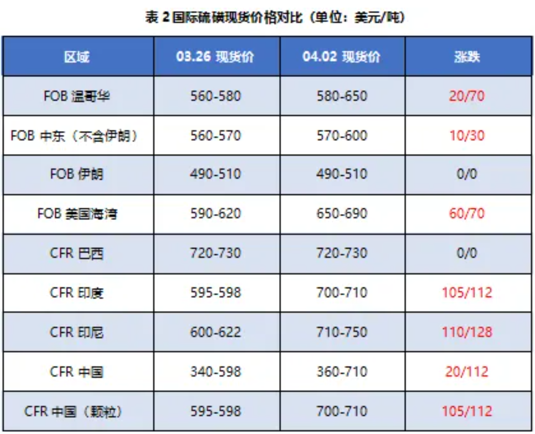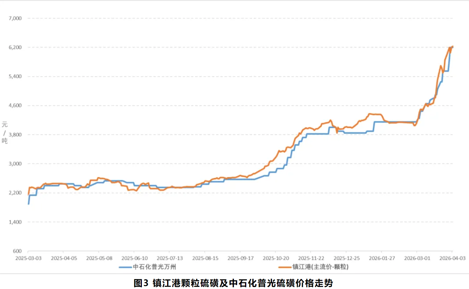 本周期鎮江港顆粒硫磺及中石化普光硫磺價格寬幅上漲。截至4月3日,鎮江港顆粒硫磺價格6230元/噸,環比上周上漲380元/噸,漲幅6.46%;中石化普光萬州硫磺價格6400元/噸,環比上周上漲850元/噸,漲幅15.32%。