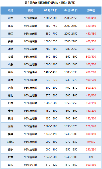 本周期國內華東、華中、華南、華北、西南等多地酸企大幅上調價格,幅度70-500元/噸。