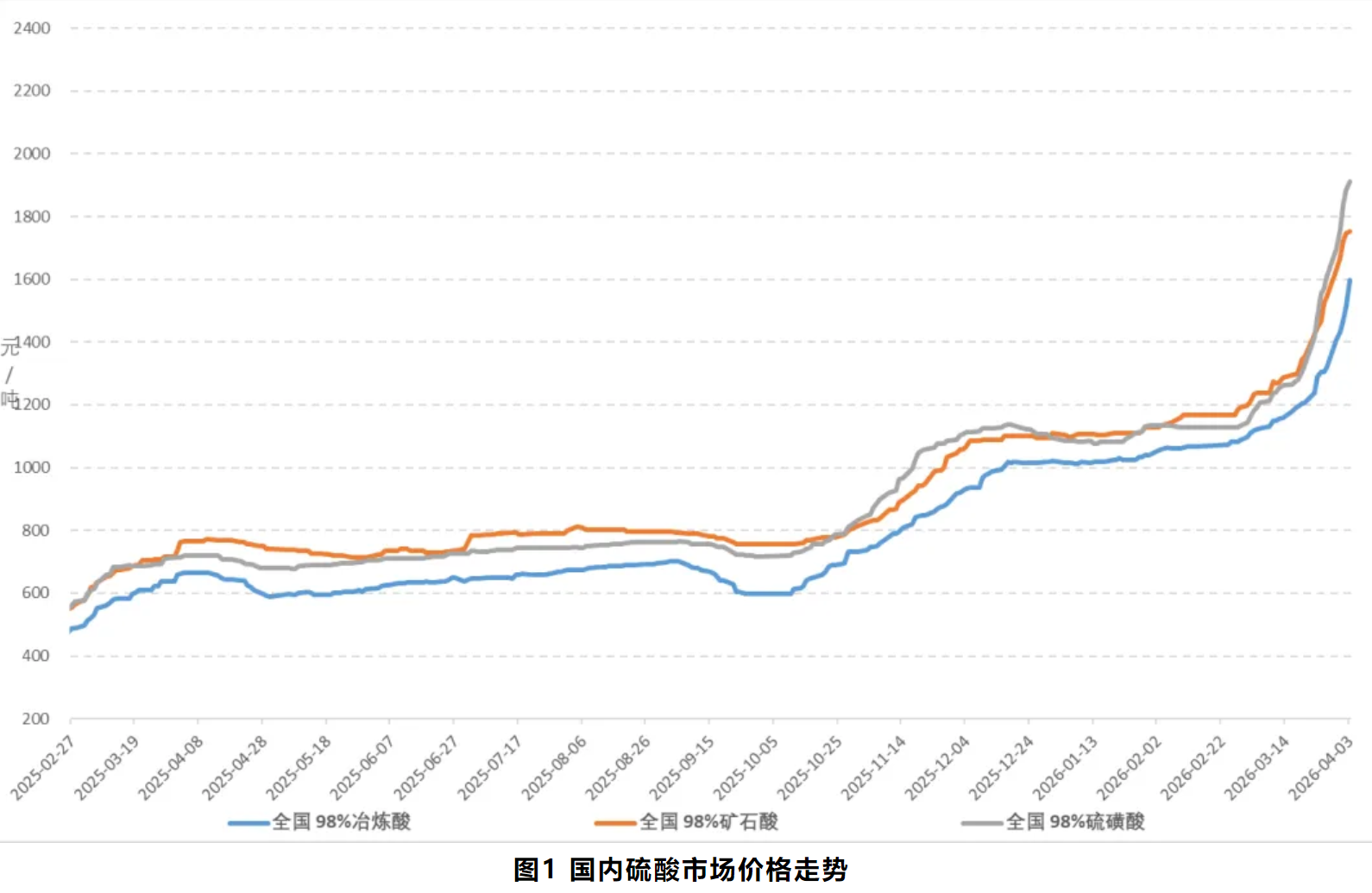 本周期國內硫酸市場價格延續強勢上行。截至4月3日,98%冶煉酸均價1596元/噸,環比上周上漲276元/噸,漲幅20.86%;98%礦石酸均價1754元/噸,環比上周上漲208元/噸,漲幅13.42%;98%硫磺酸均價1912元/噸,環比上周上漲304元/噸,漲幅18.87%。
