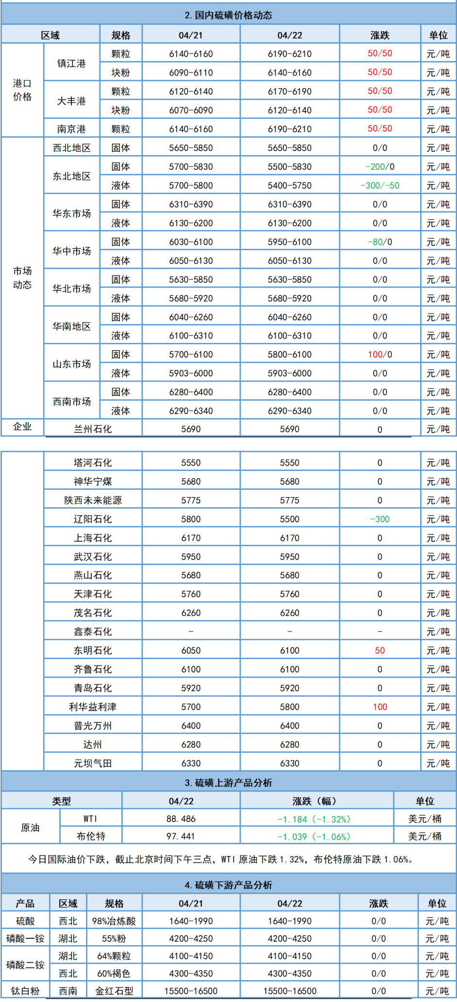 2026年4月22日硫磺日評:國產硫磺價格大穩小動,港口硫磺價格上漲