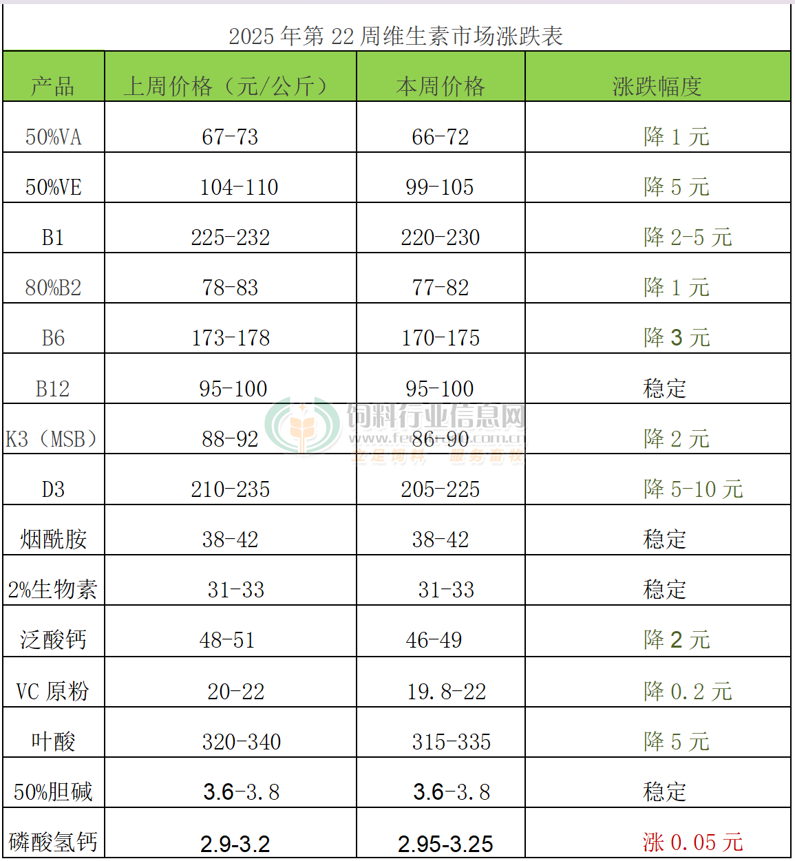 VA:本周VA市場報價66-72元/公斤。歐洲VA1000市場報價23.5-28歐元/公斤。2025年3月萬華化學VA產業鏈投產,3月12日BASF表示維生素A將于2025年4月初復產。4月22日市場稱國內部分廠家VA產品停報。5月15日市場稱帝斯曼VA生產線計劃從7月中旬起按計劃停產檢修14周。