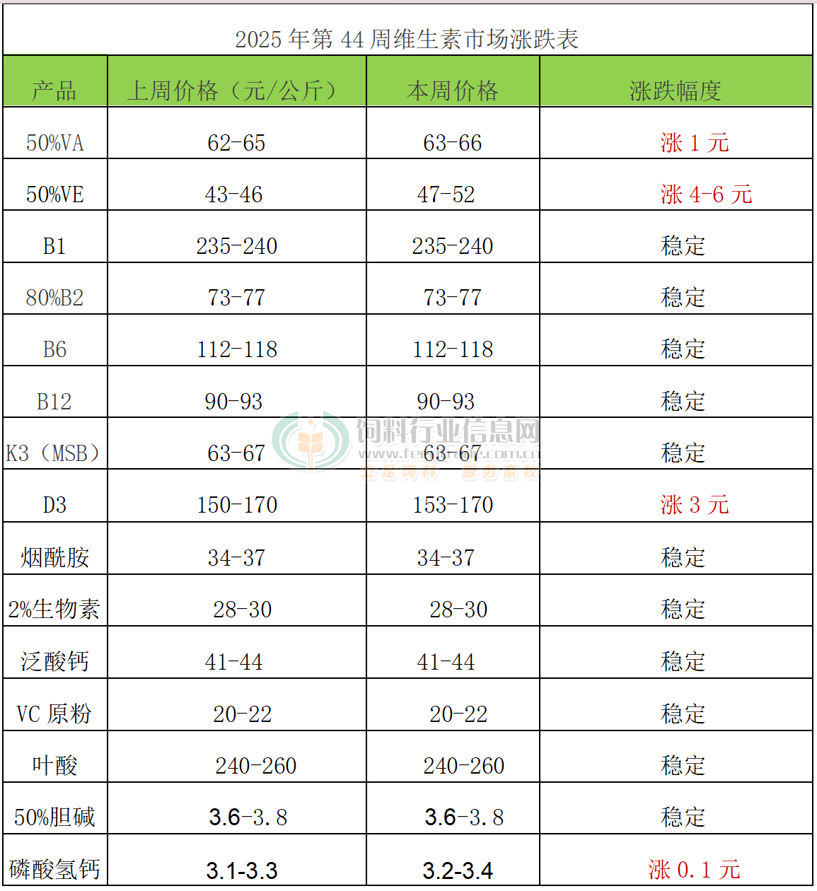VE:本周VE市場報價47-52元/公斤。歐洲VE市場報價5.5-6歐元/公斤。北沙制藥計劃7月開始停產檢修10-11周。8月7日BASF宣稱VE產品解除不可抗力狀態。10月23日市場稱國內有廠家提價至52元/公斤。10月30日市場稱浙江醫藥VE產品報價提至60元/公斤,市場供應偏緊,報價上漲。