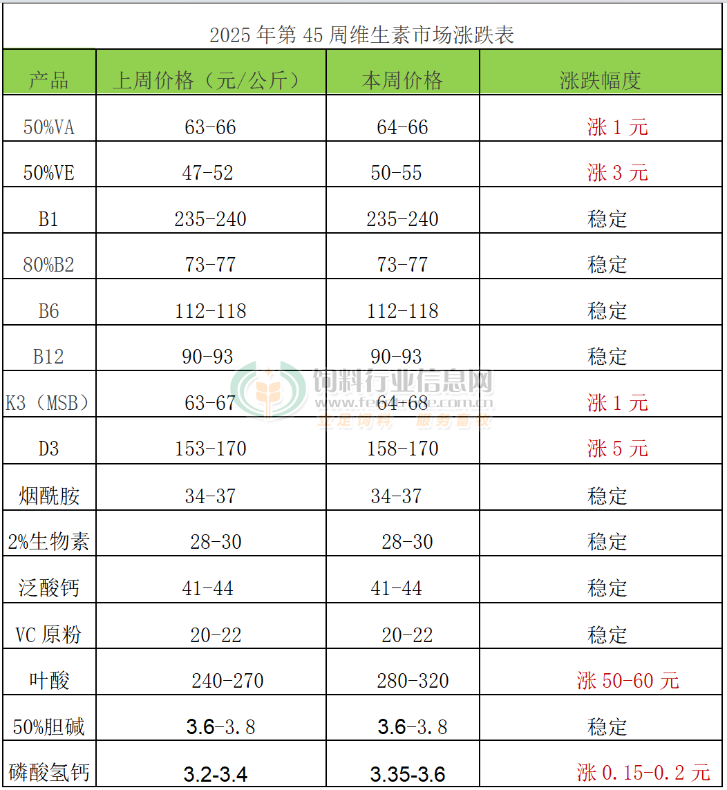 VE:本周VE市場報價50-55元/公斤。歐洲VE市場報價5.5-6歐元/公斤。北沙制藥計劃7月開始停產檢修10-11周。8月7日BASF宣稱VE產品解除不可抗力狀態。10月23日市場稱國內有廠家提價至52元/公斤。10月30日市場稱浙江醫藥VE產品報價提至60元/公斤,市場供應偏緊,報價上漲。11月3日市場稱益曼特計劃自11月初檢修至12月底。