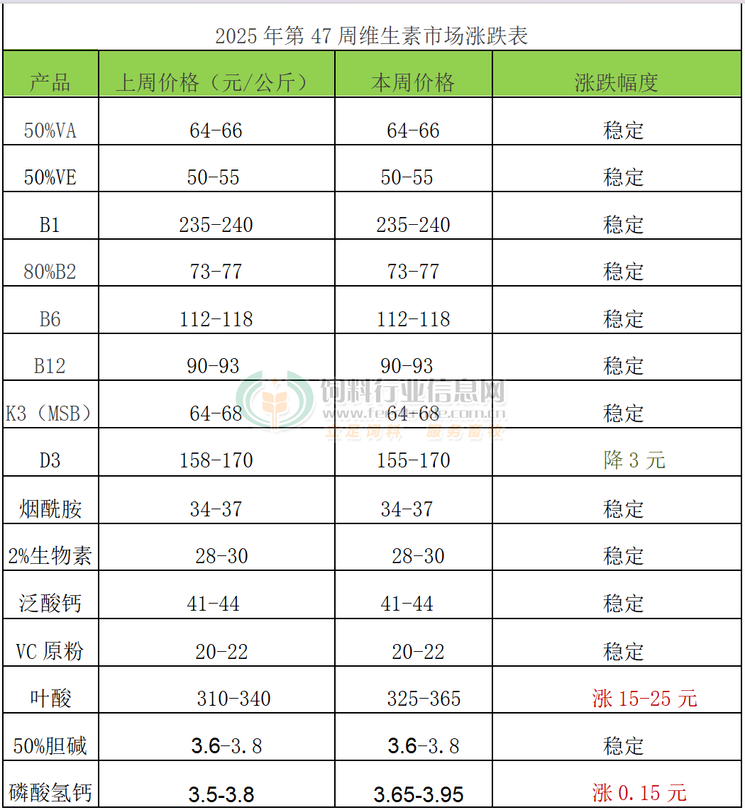 葉酸:本周市場報325-365元/公斤左右?!〗赵仙蠞q,部分廠家停報或提價,市場偏強運行。11月21日市場稱部分廠家提價至460元/公斤。