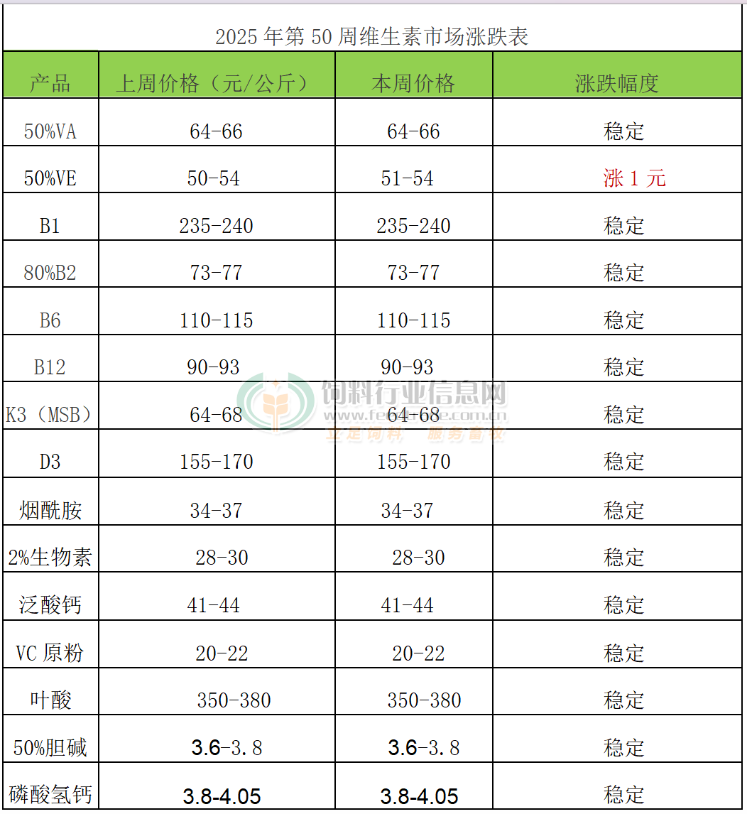 VE:本周VE市場報價51-54元/公斤。歐洲VE市場報價5.5-6歐元/公斤?! W洲VE市場報價5.5-6歐元/公斤。北沙制藥計劃7月開始停產檢修10-11周。8月7日BASF宣稱VE產品解除不可抗力狀態。10月30日市場稱浙江醫藥VE產品報價提至60元/公斤。11月3日市場稱益曼特計劃自11月初檢修至12月底。12月1日市場稱新和成VE產品提價至65元/公斤,市場成交上行。