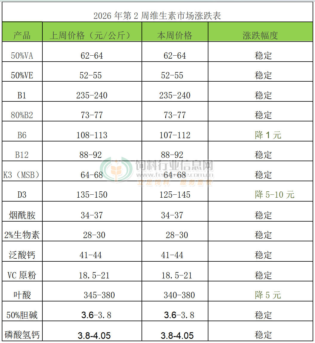 VA:本周VA市場報價62-64元/公斤。歐洲VA1000市場報價15-16歐元/公斤。2025年3月萬華化學VA產業鏈投產。6月12日巴斯夫VA解除不可抗力影響。10月28日市場稱部分廠家報價提至70-72元/公斤。12月30日市場稱浙江醫藥VA產品停報。2026年1月6日市場稱新和成VA提價至70元/公斤。
