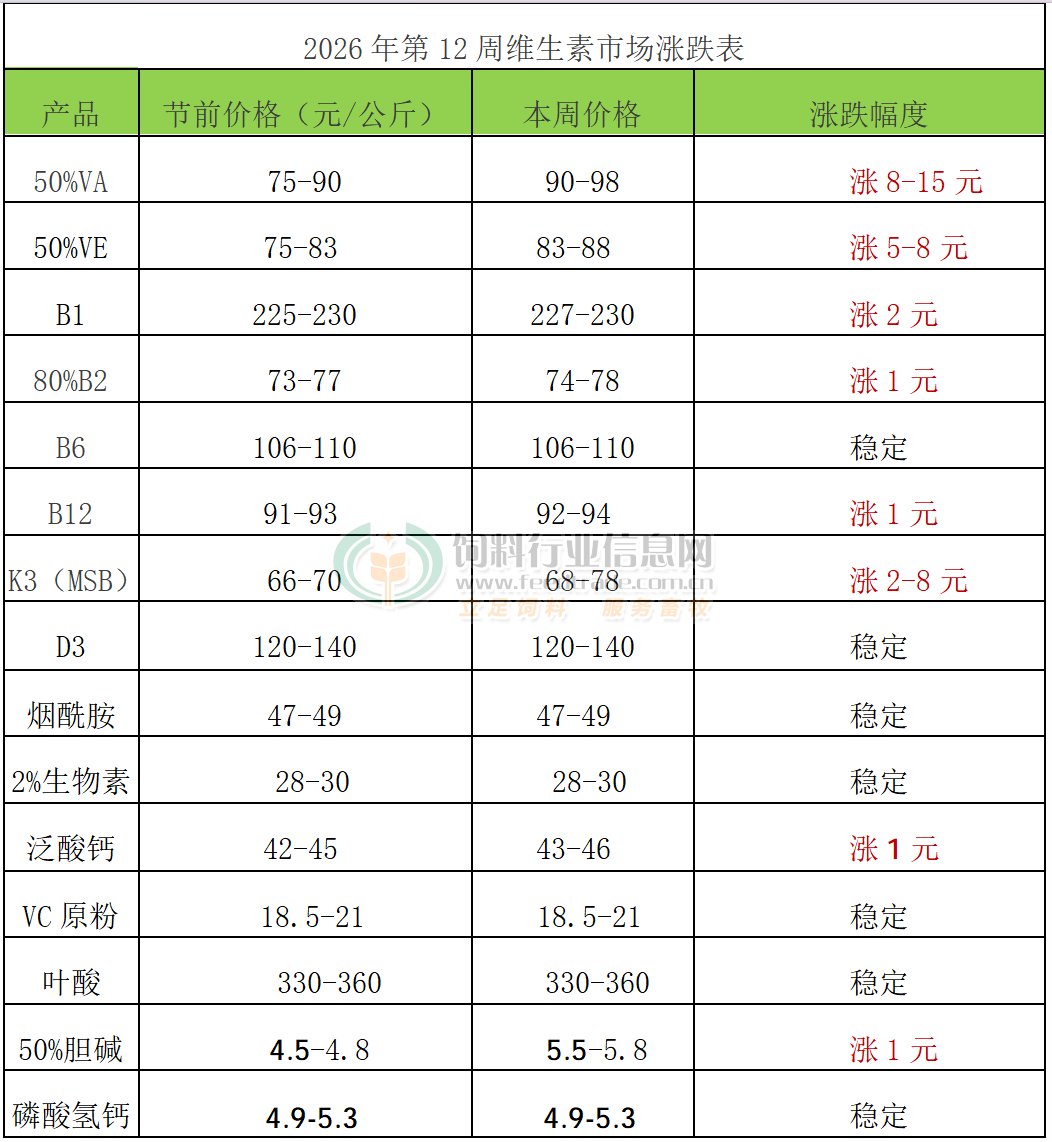 B12:本周市場報價92-94元/公斤左右,3月廠家挺價意愿增加,市場購銷好轉,穩中偏強整理。