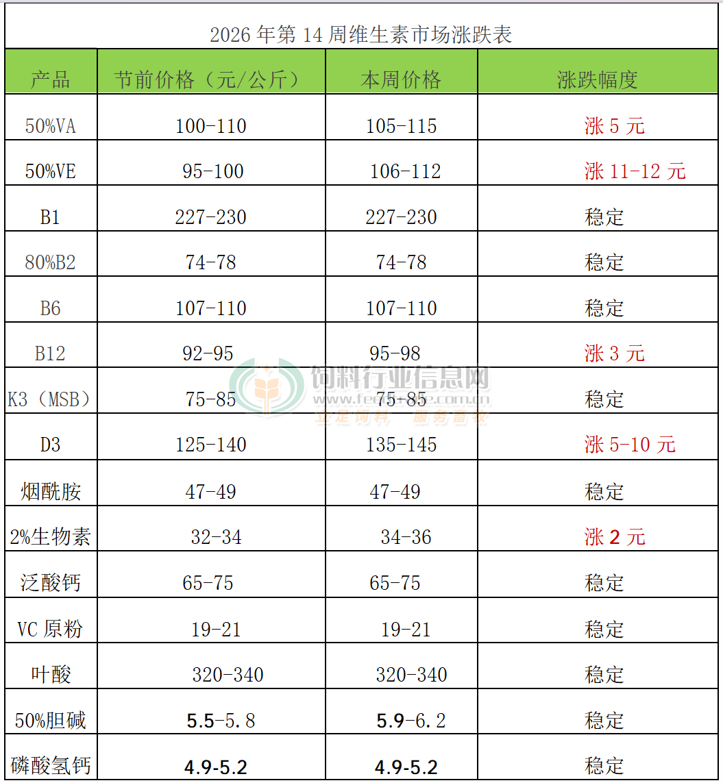 VA:本周VA市場報價105-115元/公斤。歐洲VA1000市場報價16-17歐元/公斤。2026年1月市場稱國內部分廠家VA產品提價至70-75元/公斤。3月9日市場稱國內廠家停報,3月24日市場稱有廠家報價150元/公斤,3月26日市場稱浙江醫藥VA VE D3產品停報。