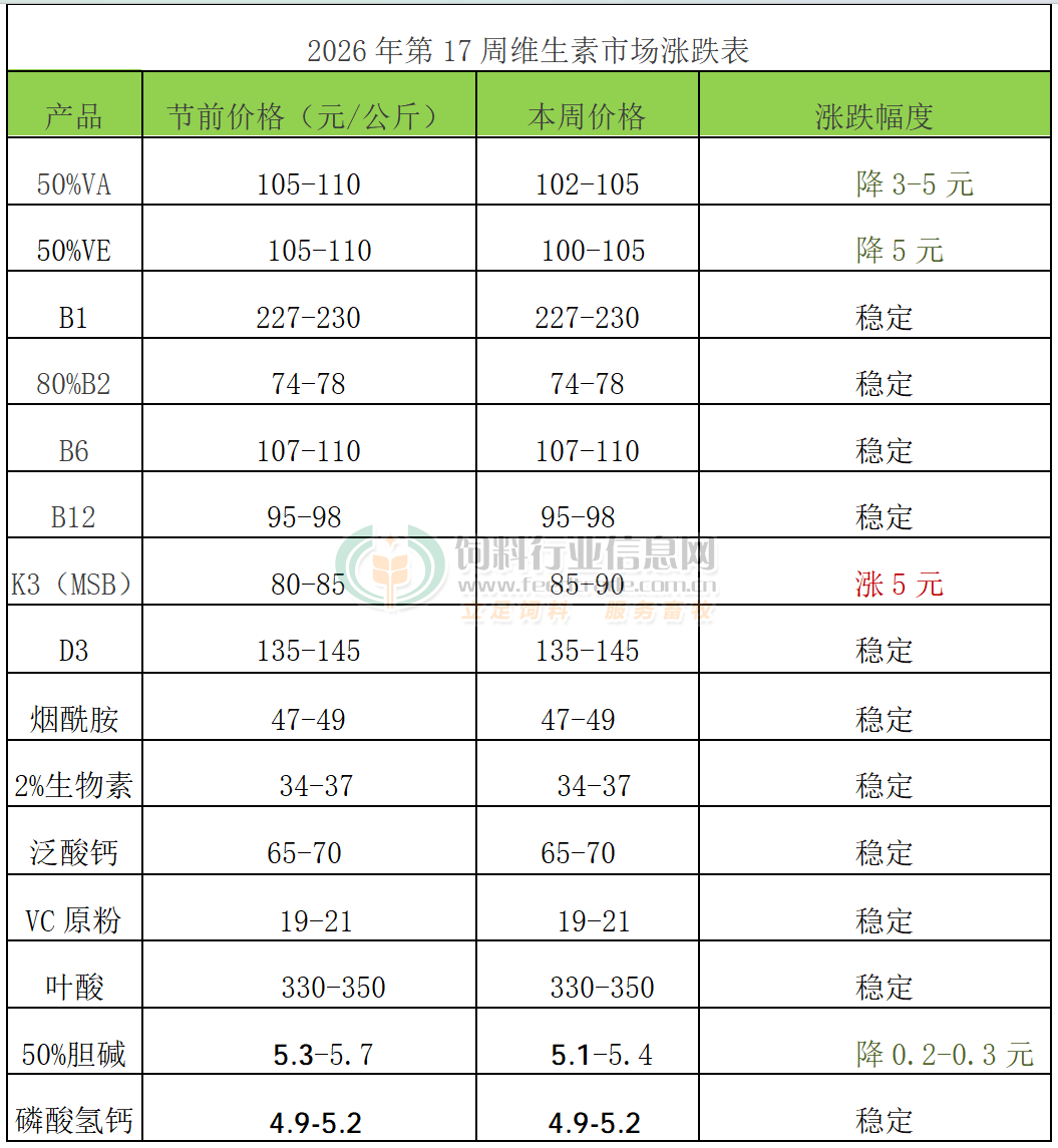 VA:本周VA市場報價102-105元/公斤。歐洲VA1000市場報價19-21歐元/公斤。2026年3月24日市場稱有廠家報價150元/公斤。4月8日市場稱有廠家報價180元/公斤. 4月10日市場稱天新藥業VA產品停報。4月14日市場稱浙江醫藥VA VE產品停報。