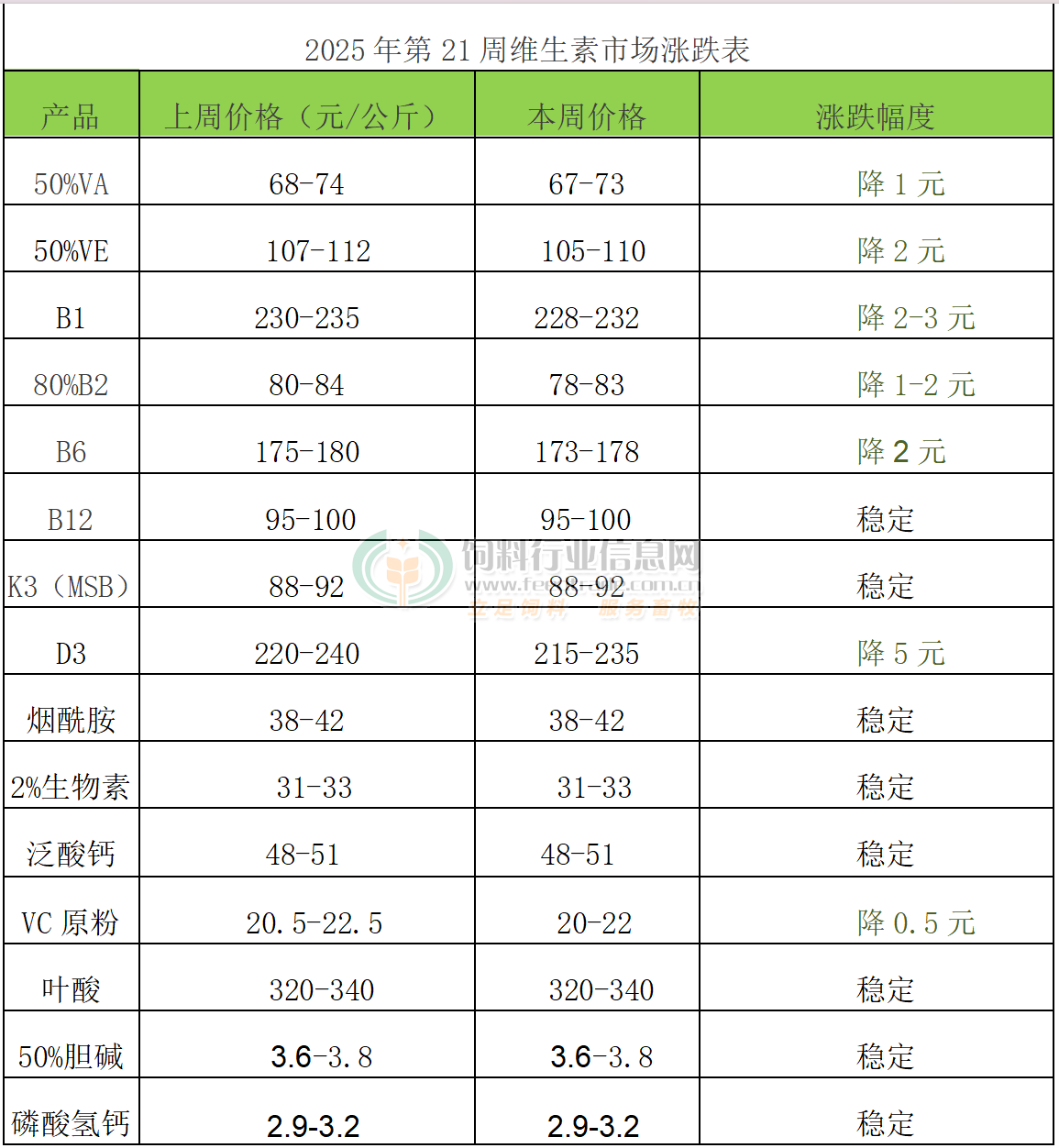 2025年第21周添加劑漲跌榜