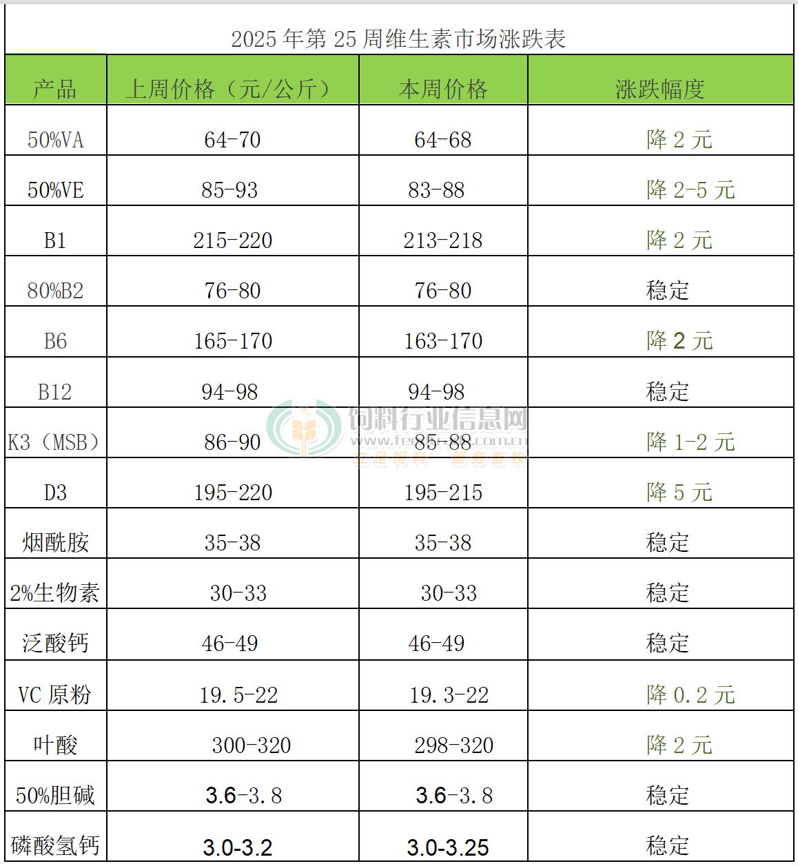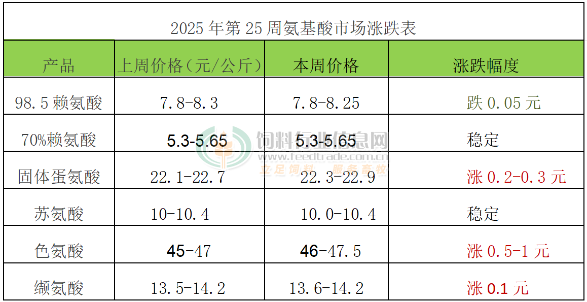 2025年第25周添加劑漲跌榜