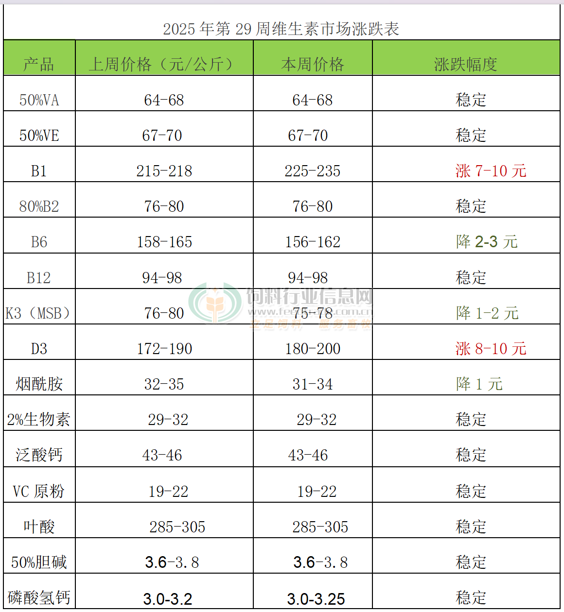 2025年第29周添加劑漲跌榜