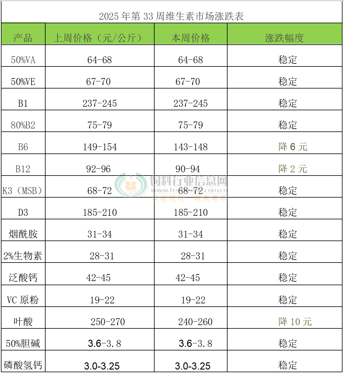 2025年第33周添加劑漲跌榜