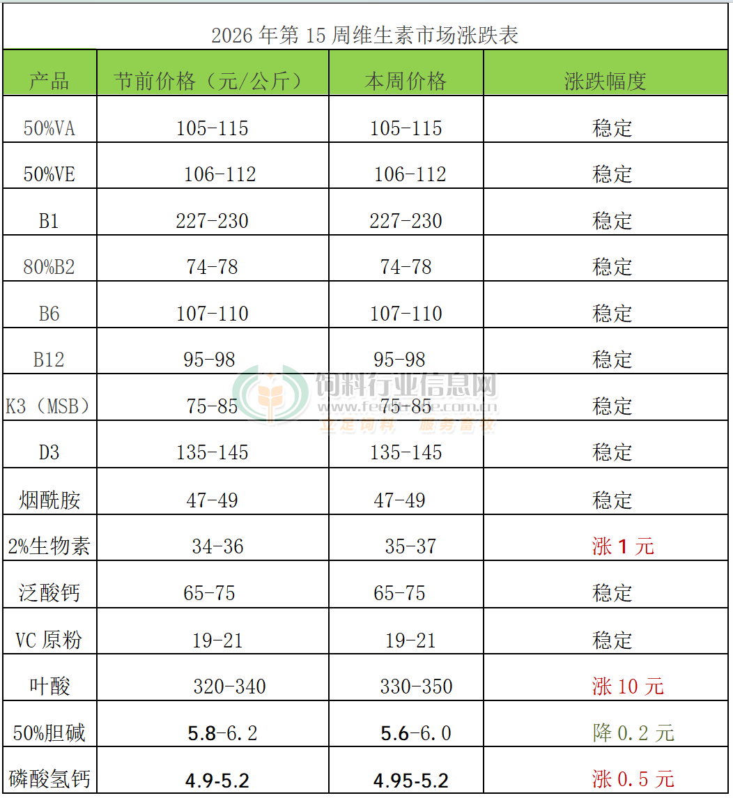2026年第15周添加劑漲跌榜
