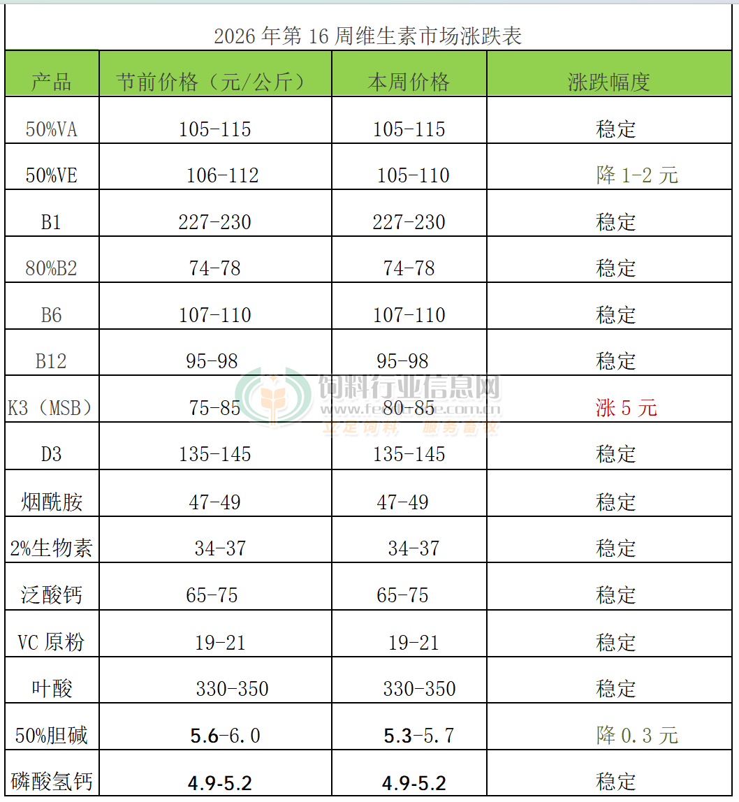 2026年第16周添加劑漲跌榜