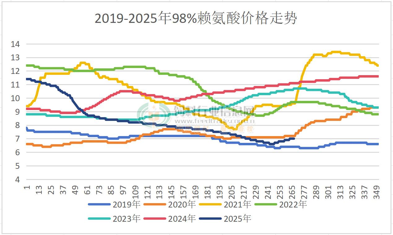 9月賴氨酸市場觸底回暖,9月1日有廠家98%賴氨酸報價6.6元/公斤,70%賴氨酸報價4.6元/公斤,跌至歷史底部區間,下游補庫意愿好轉,加上較多廠家檢修,9月10日市場稱有廠家98%賴氨酸報價漲至6.85元/公斤,節前補貨促進成交,9月98%賴氨酸市場小幅反彈。10月新季玉米集中上量以及梅花生物80%賴氨酸投產影響,預計10月賴氨酸市場低位震蕩整理。后續需注意廠家動態以及出口量價等。