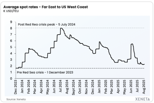 Xeneta數據顯示,自2024年7月達到峰值以來,美線平均現貨運價總體呈下降趨勢,自今年6月1日以來又暴跌59%,目前達到2023年12月31日以來的最低水平。