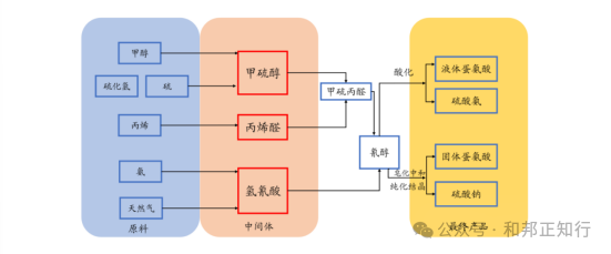 從生產工藝看,兩者均以化學合成法為主流技術路線,其中海因法和氰醇法是主流選擇。海因法用于制備固體蛋氨酸,氰醇法既可制備固蛋,也可以制備液蛋。氰醇法制固體蛋氨酸和液體蛋氨酸的后端工藝存在差異。固體蛋氨酸需經過結晶、分離、干燥等復雜工序(即下圖中的皂化反應與純化結晶),對設備精度與能耗要求較高,2025年3月新和成固體蛋氨酸項目就曾因能耗問題遭遇節能審查未通過的情況;液體蛋氨酸則省去了結晶干燥環節,工藝流程更短,環保壓力相對較小,這也是國際蛋氨酸龍頭企業安迪蘇側重液體產能布局的重要原因。
