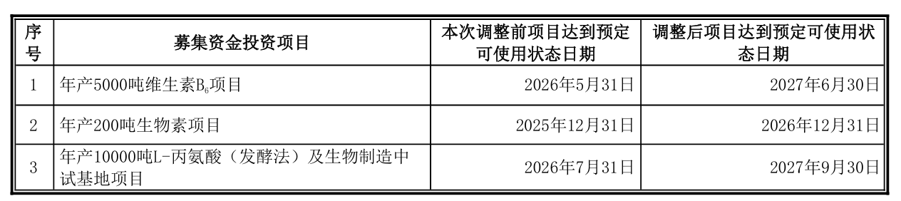 公司結合當前募投項目的實際建設情況和投資進度,在實施主體、實施地點及投資規模不發生變更的情況下,將“年產5000噸維生素B6項目”“年產200噸生物素項目”和“年產10000噸L-丙氨酸(發酵法)及生物制造中試基地項目”達到預計可使用狀態的日期延長,具體情況如下: